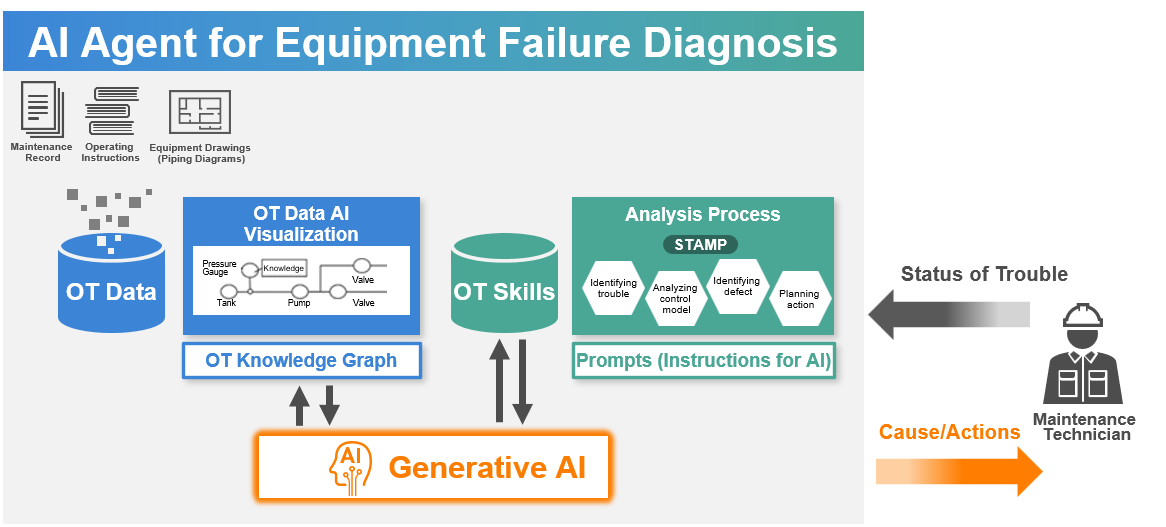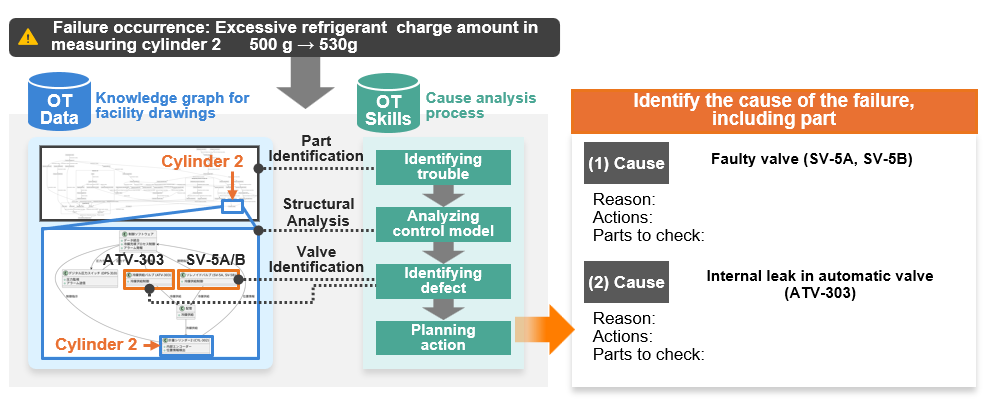 Ініціатива використовуватиме багаторічний досвід операційних технологій на робочих майданчиках Daikin і Hitachi і об’єднуватиме їх з сучасними розробками Hitachi в сегменті інформаційних технологій. Коли технічний спеціаліст, озброєний планшетом, виявляє несправність насоса або клапана підчас перевірки технологічного обладнання, агент штучного інтелекту для діагностики можливих дефектів вкаже йому причину та необхідні коригувальні дії. Система перетворює спочатку креслення заводського обладнання, накопичені Daikin, наприклад різного виробничого та інженерного обладнання, у так звані графіки знань, тобто моделі даних, що виражають знання у формі графіка, з якими може працювати генеративний штучний інтелект. Потім, генеративний штучний інтелект вивчає дані операційних технологій, які включають графіки знань, записи технічного обслуговування та навички операційних технологій – унікальний процес аналізу причин відмови обладнання компанії Hitachi (патент очікується) на основі моделі причинного зв’язку аварій, заснованої на теорії систем STAMP та інших. Це забезпечує діагностику несправностей, що відповідає або перевищує можливості звичайних фахівців з технічного обслуговування компанії Daikin. Попереднє демонстраційне випробування підтвердило, що агент штучного інтелекту для діагностики несправностей обладнання може визначити причину несправності та рекомендувати коригувальні дії протягом 10 секунд з точністю понад 90%.