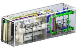 Система включає одно- або багатокомпресорні чилери з магнітними підшипниками, інверторні насоси охолодженої та конденсаторної води, а також контейнер з інтегрованою шумо- та теплоізоляцією. Вбудована панель електричного пускача та розподільний щит суттєво спрощують встановлення та експлуатацію. Доступні з продуктивністю від 200 до 1500 тон, розміри установки варіюються від 9,5 x 2,6 x 3,3 м для моделей 250 тон до 14 x 4,2 x 4,2 м для систем 1300 тон, що робить її масштабованим та ефективним вибором для сучасних кліматичних систем. Порівняно із звичайними та платформовими системами, MCP зменшує площу інсталяції до 70%.