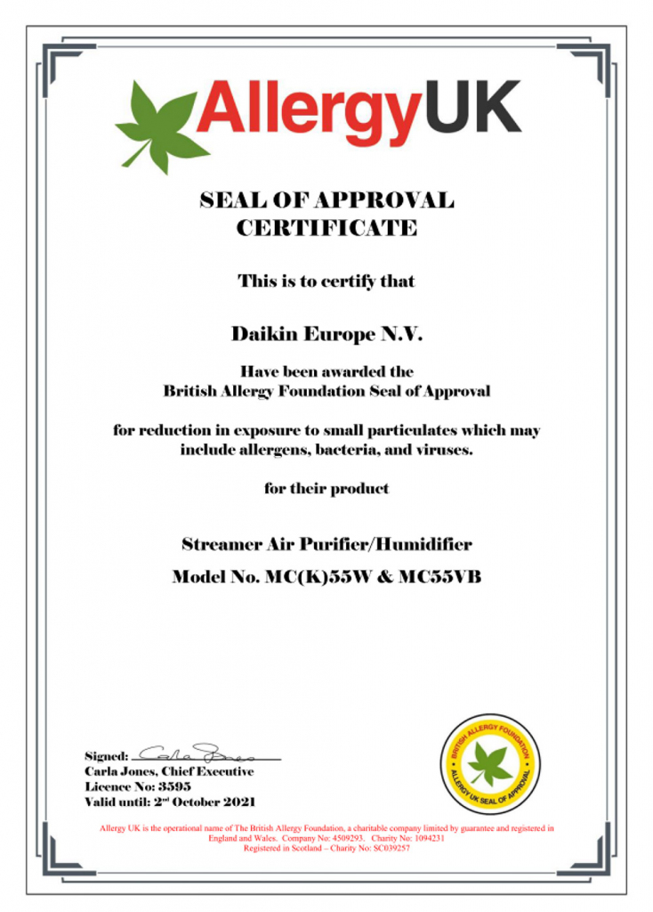 Компанія DENV отримала сертифікат від Британського Благодійного Фонду Допомоги Хворим на Алергію, власника Схвальної Відзнаки Якості Allergy UK, на право використання цієї Відзнаки на своїх моделях очищувачів повітря MC55W, MC55VB та MCK55W.