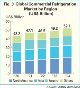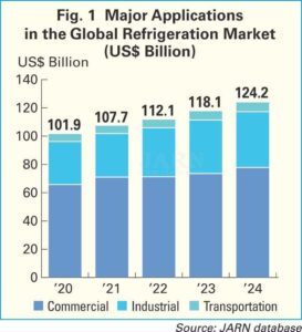ЯПОНІЯ: Як свідчить база даних японського видання JARN, що висвітлює новини світової галузі кондиціювання повітря, опалення та холодильної техніки, глобальний ринок холодильного обладнання у 2024 році зріс на 5,2% у річному обчисленні, досягнувши позначки US$124,2 млрд. Комерційний сектор становив понад 60% від загального обсягу, тоді як його вартість оцінювалася в US$77,8 млрд. Промисловий сектор склав близько 32%, досягнувши US$39,5 млрд, а решту сегмента становили рефрижераторні перевезення, що склали US$6,9 млрд. Приблизно 67% від загального показника припало на продаж обладнання, а решту становили такі послуги, як інсталяція та обслуговування.