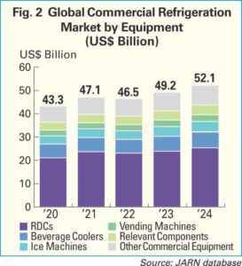 Згідно з базою даних видання JARN, світові продажі комерційного обладнання досягли позначки US$52,1 млрд., збільшившись тим самим на 6,0%. Холодильні вітрини становили 48,7%, з темпами зростання 6,2%. Льодогенератори склали 8,4%, а торговельні автомати – 5,6%. Відповідні компоненти становили 8,1%. Показник охолоджувачів для напоїв дорівнював близько 13% з найвищим темпом зростання в цій категорії – 7,8%. Інше комерційне обладнання отримало частку понад 16% у 2024 році.