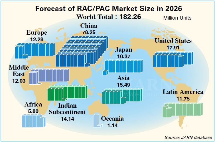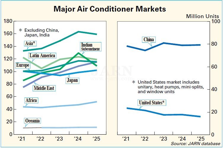 База даних видання JARN показує, що ринок побутових кондиціонерів повітря на Близькому Сході у 2025 році зріс на 5,6%, тоді як напівпромисловий ринок – на 10,4%, досягнувши сукупно позначки 11,0 млн. систем. Регіон залишається одним з найшвидше зростаючих кондиціонерних ринків у світі, що підтримується екстремальними кліматичними умовами та численними новими факторами попиту. Масштабні інвестиції Саудівської Аравії в інфраструктуру стимулюють значні потреби в кондиціонерах. Приплив населення, спричинений збройною агресією росії проти Україні та війною між Ізраїлем і Палестиною, помітно збільшує купівельну спроможність в Об’єднаних Арабських Еміратах та Саудівській Аравії. Урбанізація, економічна життєздатність та зростання щільності населення продовжують посилювати ринковий імпульс. Після років двозначного зростання ринок кондиціонерів в Іраку різко впав у 2025 році, проте ринок реконструкції свідчить про солідний довготерміновий потенціал.