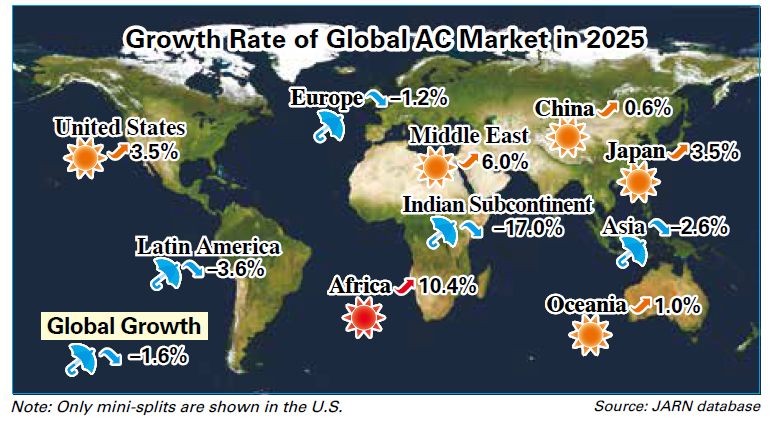ЯПОНІЯ: У 2025 році світовий ринок побутових та напівпромислових кондиціонерів повітря втратив темпи зростання. Низькі температури та менш спекотне літо в багатьох регіонах знизили попит на побутові системи, тоді як уповільнення світової економіки та млява активність на ринку нерухомості ще більше знизили купівельну спроможність споживачів. Водночас загострена геополітична напруженість порушила стабільність ланцюга поставок продукції збоку виробників та створила нові ризики для безпеки морських перевезень для дистрибуції, додавши тим самим невизначеності до діяльності галузі.