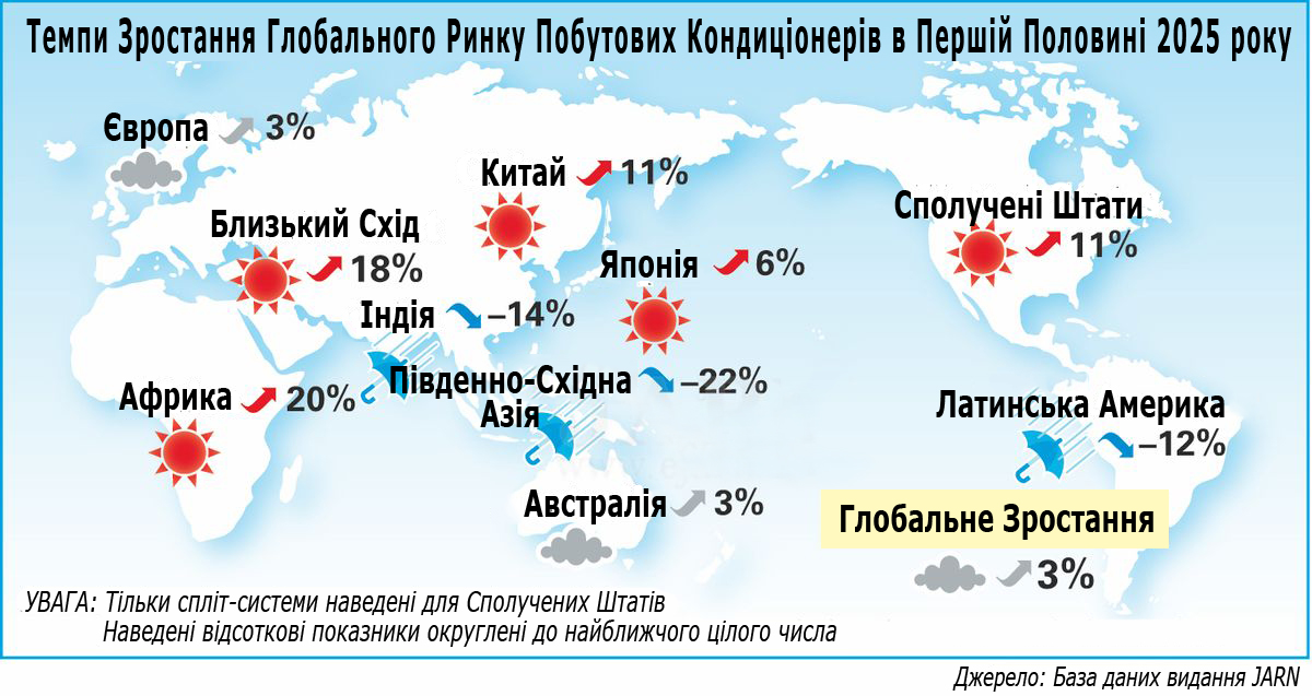 В результаті, продажі побутових кондиціонерів (RAC) були низькими протягом пікового сезону продажів, а світовий попит на ці системи зріс лише на 2,6% у річному обчисленні. Незважаючи на загальне уповільнення, ринки, що розвиваються – Африка та Близький Схід – спостерігали значне зростання попиту на побутові кондиціонери. Китай також продемонстрував впевнений зріст. Навіть на розвиненому японському ринку надзвичайно спекотна погода та державні субсидії на високопродуктивні побутові системи сприяли потужному зростанню. Крім того, спека, що поширилася в деяких частинах Європи та Південно-Східної Азії з кінця червня, підвищила очікування щодо помірного відновлення ринку в другій половині року.