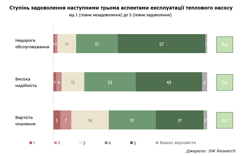 Лише 5% заявили, що незадоволені своїм тепловим насосом. Для порівняння: серед користувачів газових бойлерів близько 60% повідомили про задоволення, тоді як показник серед користувачів пелетних бойлерів досяг близько 70%.