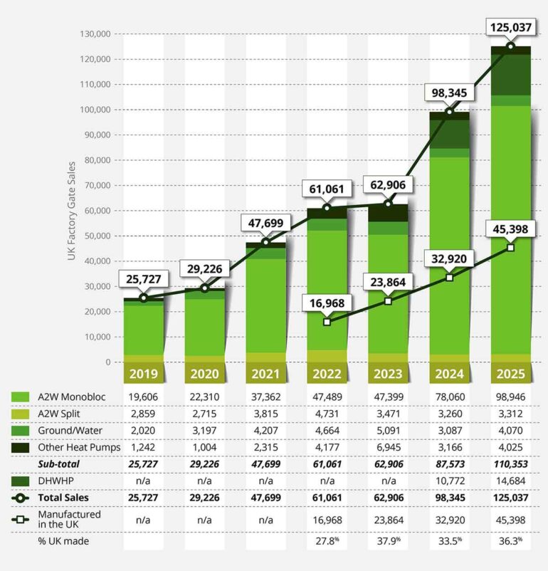 ВЕЛИКА БРИТАНІЯ: Продажі теплових насосів в країні досягли чергового рекордного рівня у 2025 році – 125 037 систем, що на 27% більше, ніж у попередньому 2024 році.