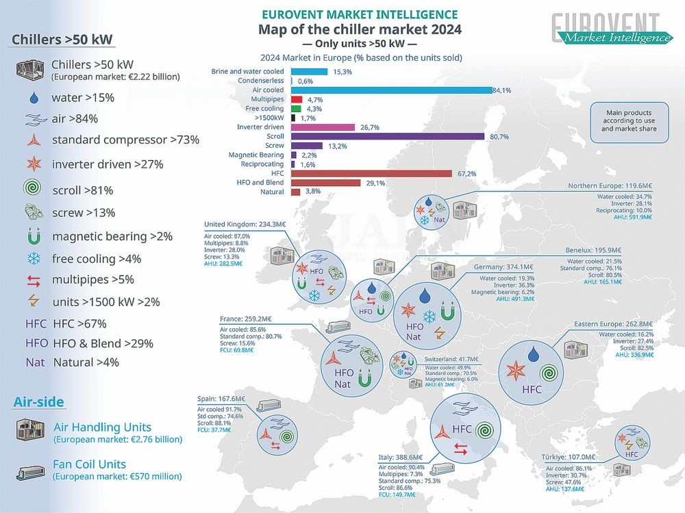 ЯПОНІЯ: У 2024 році європейський ринок чилерів потужністю понад 50 кВт, що складається з 27 країн Європейської Унії, Балканських країн, Норвегії, Туреччини, України та Великої Британії, досяг позначки €2,22 млрд. або близько US$2,40 млрд., демонструючи значне зростання за вартісним показником – на 14%.