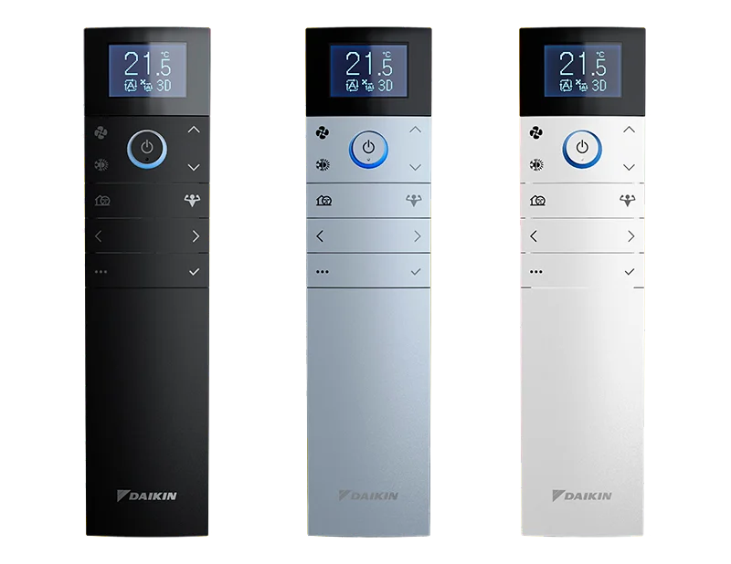 Доступний у сріблястому, матовому білому та матовому чорному кольорах, пульт пасує до кольорів кондиціонера Daikin Emura.